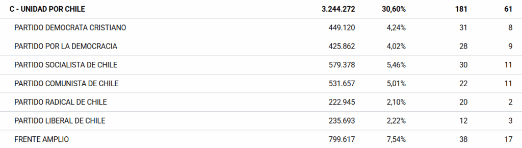 Respecto a la Cámara de Diputadas y Diputados, se eligieron a 155 diputados, de los cuales 61 pertenecen a Unidad por Chile, mientras que la oposición logró imponerse con 90: 42 de Cambio por Chile, 34 de Chile Grande y Unido y 14 del Partido de la Gente, este último consiguiendo finalmente representación en la cámara baja.