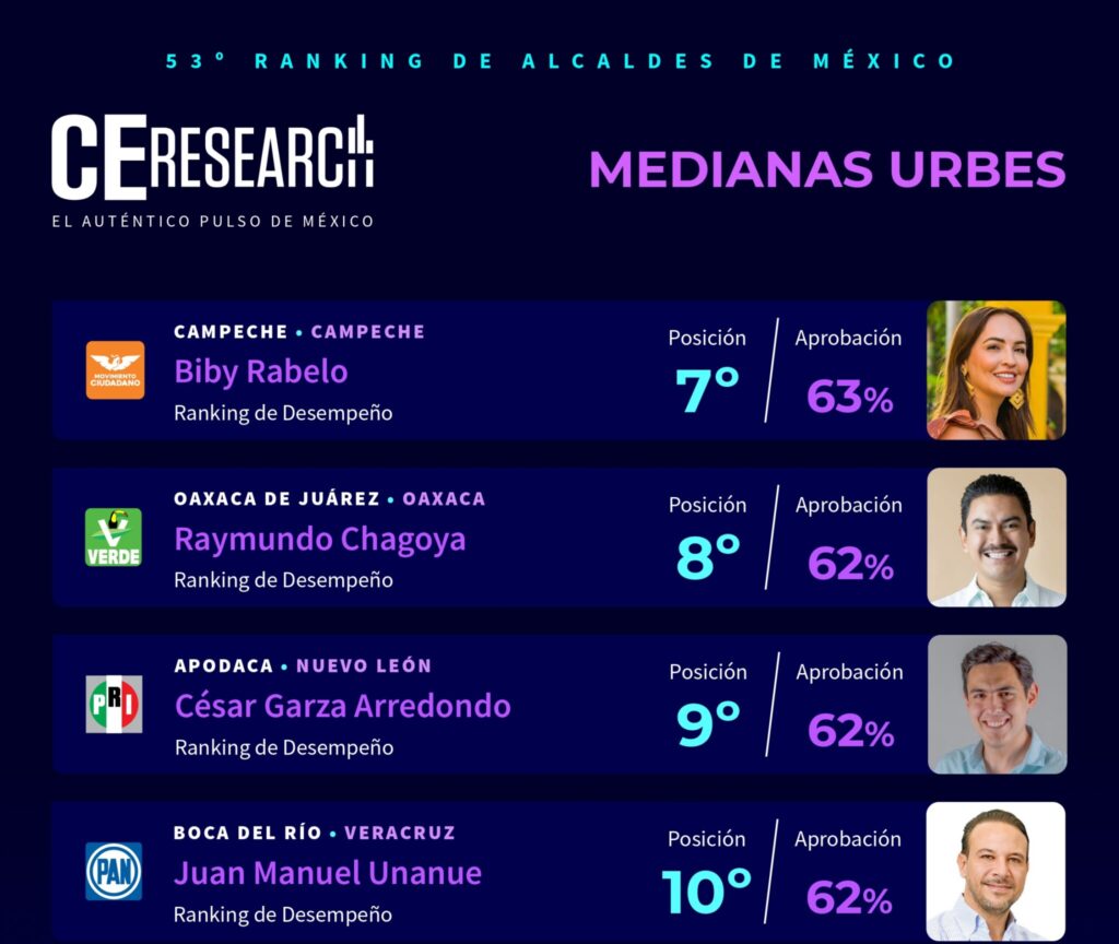 El Top 10 lo completan Jacobo Rodríguez de Piedras Negras, Coahuila (63%), Biby Rabelo de Campeche capital (63%), Raymundo Chagoya de Oaxaca de Juárez, Oaxaca (62%), César Garza Arredondo de Apodaca, Nuevo León (62%) y Juan Manuel Unanue de Boca del Río, Veracruz (62%).