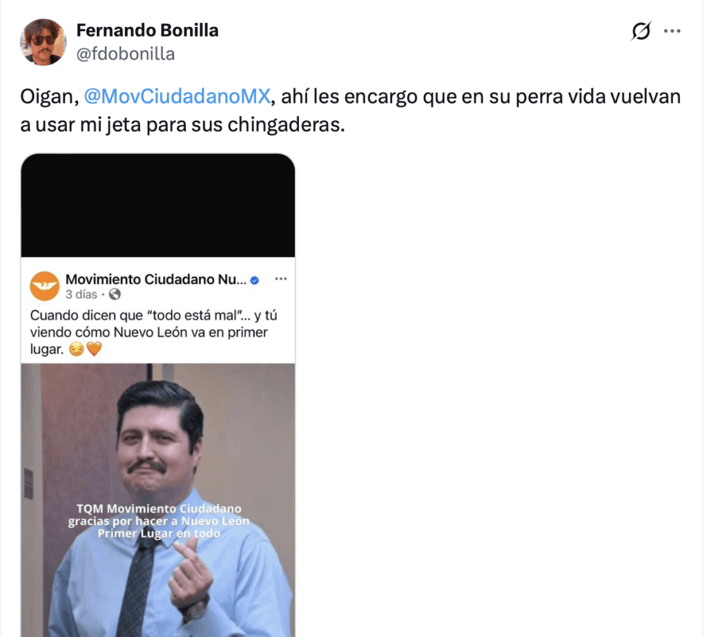 La respuesta del actor no se hizo esperar y publicó: “Oigan, @MovCiudadanoMX, ahí les encargo que en su perra vida vuelvan a usar mi jeta para sus chingaderas”, en su cuenta de X.