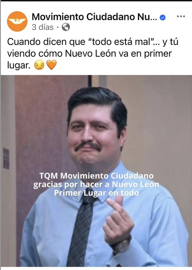 El meme estuvo acompañado de un post que reforzaba la idea de destacar el gobierno de Nuevo León que encabeza el emecista Samuel García: “Cuando dicen que todo está mal y tú viendo como Nuevo León va en primer lugar”.