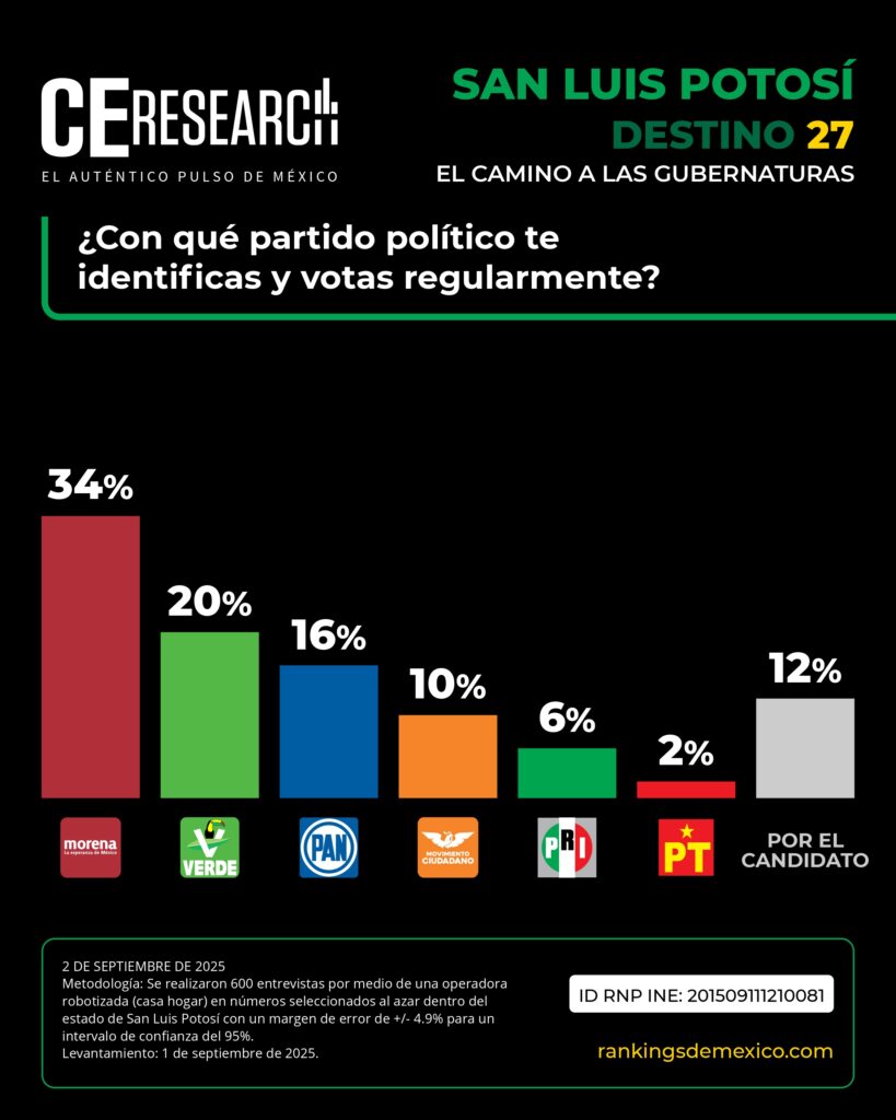 La participación del Partido Verde Ecologista de México (PVEM) sin alianza con Morena, divide en tercios la elección a la gubernatura de San Luis Potosí, reveló la última encuesta Destino 27 de CE Research.
