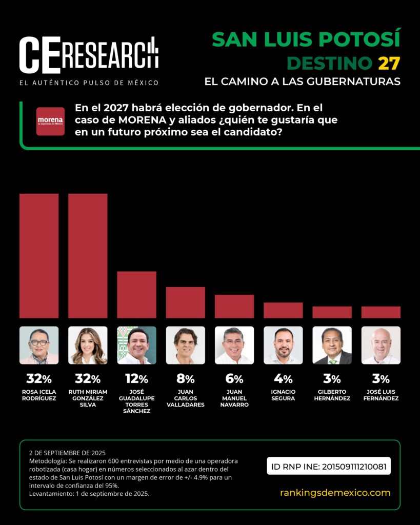 En el careo, Rosa Icela Rodríguez obtiene 31% de intención de voto, Ruth González alcanza 25% y Enrique Galindo, del PRI-PAN, logra 23%; mientras que un candidato de Movimiento Ciudadano obtendría apenas 6%. Un 15% de los encuestados permanece indeciso, convirtiendo a San Luis Potosí en un estado con una de las contiendas más cerradas.