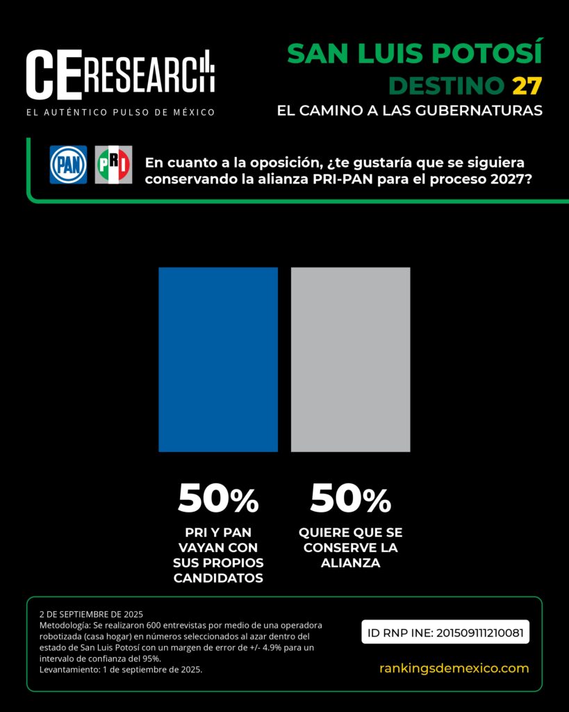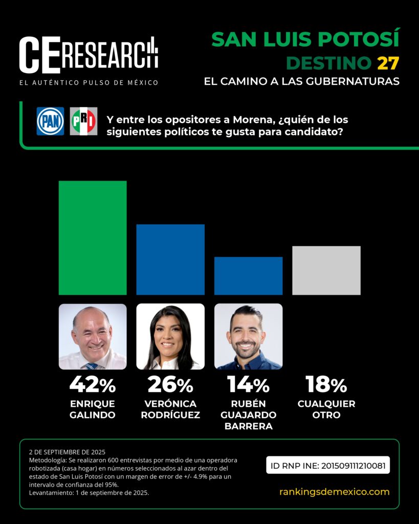 Respecto a la oposición, la ciudadanía se encuentra dividida: 50% cree que el PRI y el PAN deberían conservar su alianza rumbo al 2027, mientras que el otro 50% prefiere que compitan por separado. Dentro de los perfiles, el presidente municipal de San Luis Potosí y priísta, Enrique Galindo, se posiciona como el aspirante más competitivo con 42% de apoyo, seguido por la senadora del PAN, Verónica Rodríguez, con 26%.
