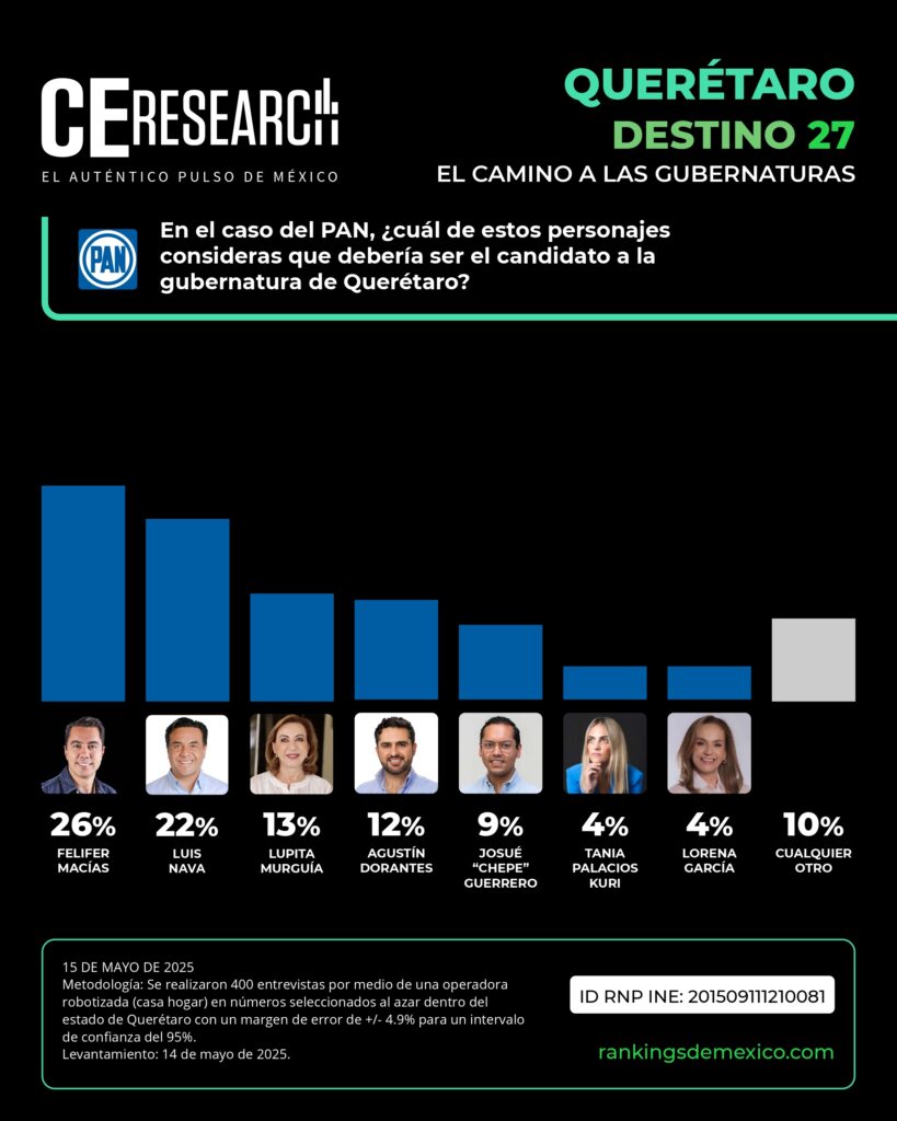CE Research. 15 de mayo 2025.- Felifer Macías logra alejarse un poco más de Luis Nava, estando ahora a 4 puntos de él en la preferencia de los queretanos buscando un candidato panista a la gubernatura.