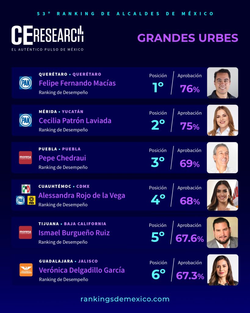 La edición 53 del Ranking de Desempeño de Alcaldes de Grandes Urbes, elaborado por la encuestadora de esta casa editorial, CE Research, destaca a Felipe Fernando Macías, presidente municipal de Querétaro, en la primera posición a nivel nacional entre las grandes urbes del país, con una aprobación ciudadana del 76%. Le siguen Cecilia Patrón Laviada, alcaldesa de Mérida, con 75%, y Pepe Chedraui, alcalde de Puebla, con 69%.