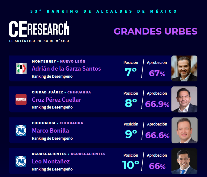 El cuarto lugar del ranking fue para Alessandra Rojo de la Vega, alcaldesa de Cuauhtémoc, Ciudad de México, con 68% de aprobación, seguida de Ismael Burgueño Ruiz, de Tijuana, con 67.6%. El Top 10 lo completan Verónica Delgadillo, de Guadalajara (67.3%), Adrián de la Garza, de Monterrey (67%), Cruz Pérez Cuéllar, de Ciudad Juárez (66.9%), Marco Bonilla, de Chihuahua (66.6%) y Leo Montañez, de Aguascalientes (66%).
