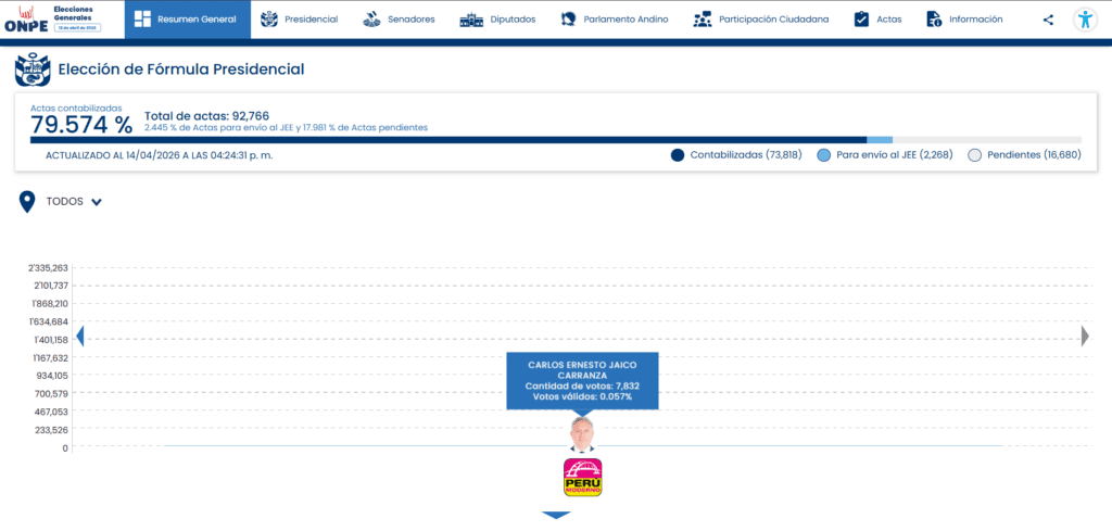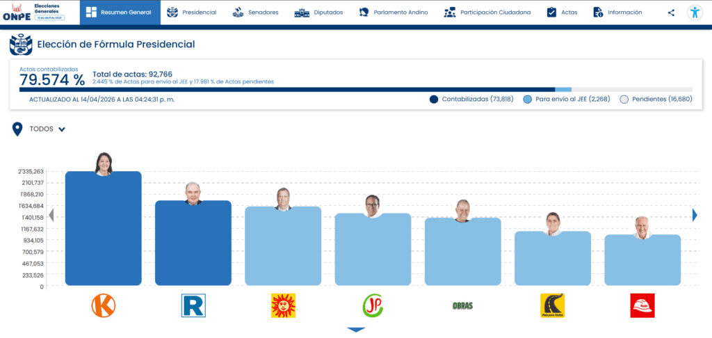 Los candidatos Rafael López de Renovación Popular y Jorge Nieto Montesinos del Partido Buen Gobierno se disputan el segundo y último boleto para competir en la segunda vuelta por la presidencia de Perú, ya que la diferencia entre uno y otro es de 0.88% y el avance en el conteo es del 79.44%, por lo que aún no hay definido para nadie.