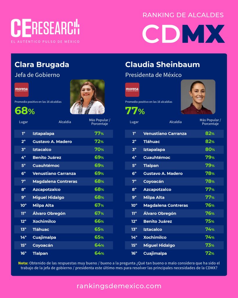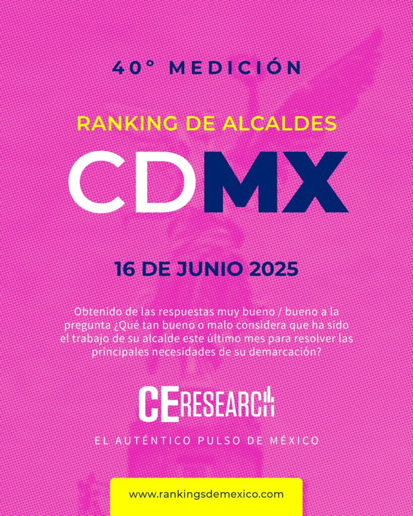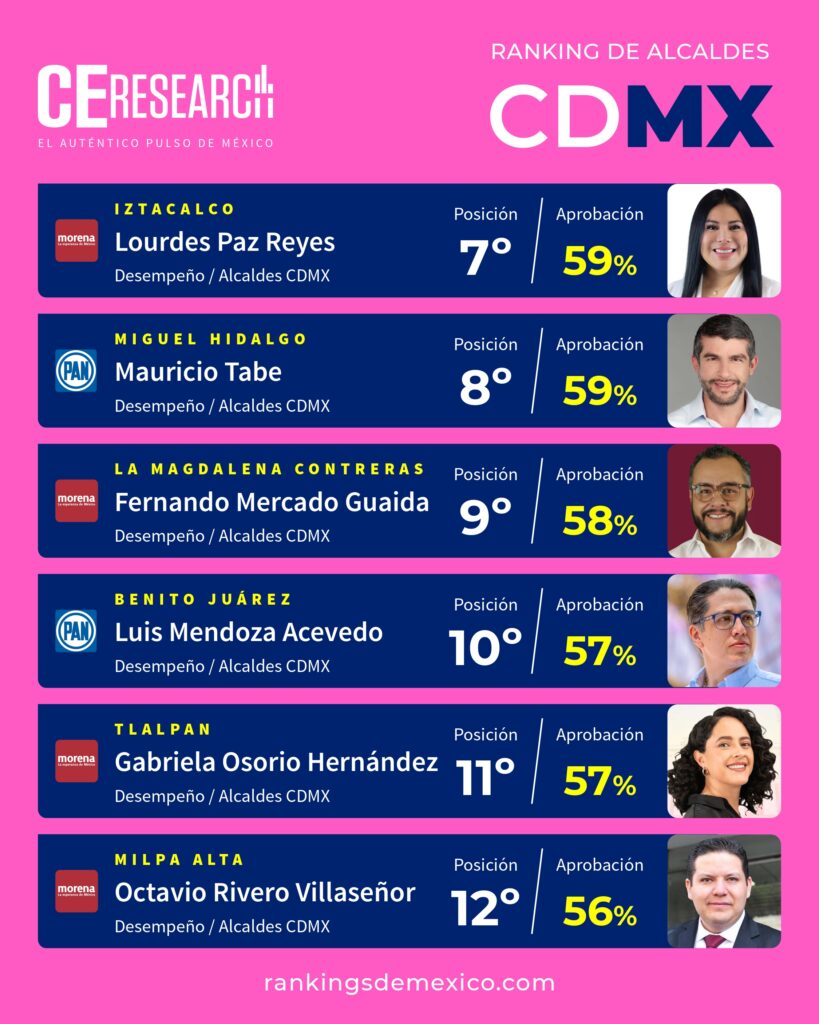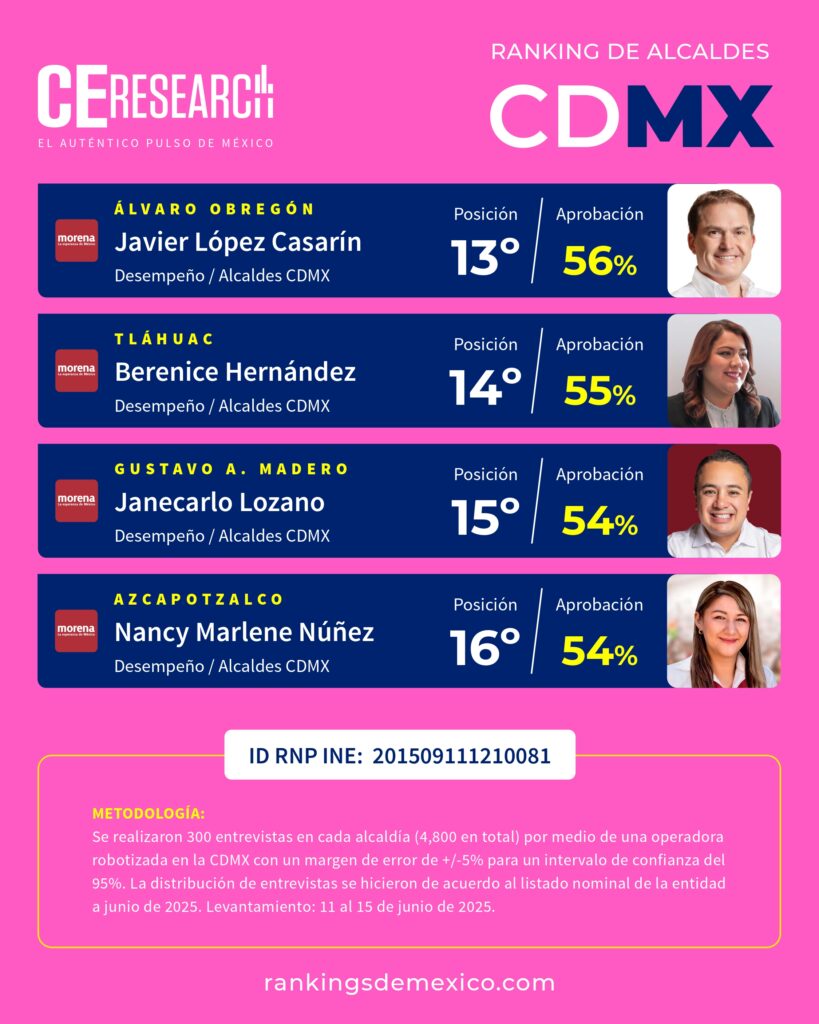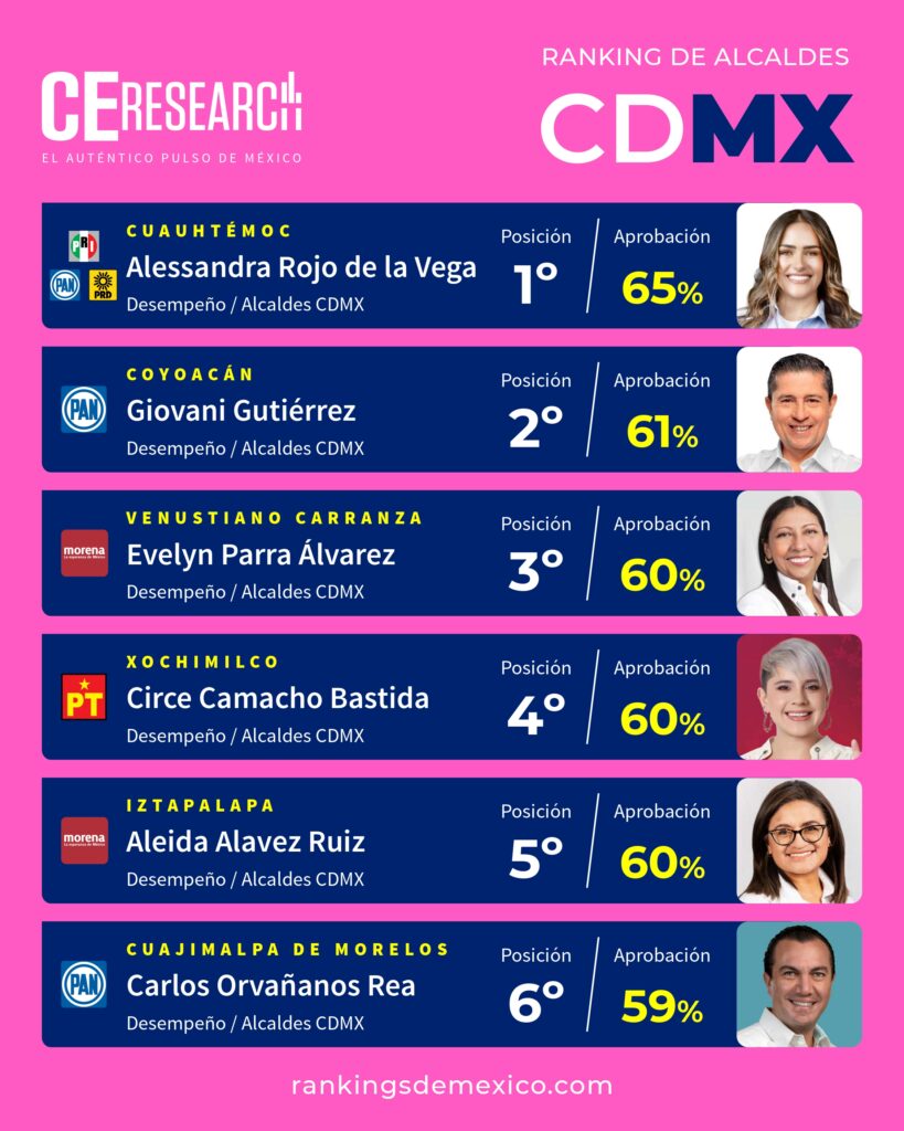 CE Research. 16 de junio 2025.- Alessandra Rojo de la Vega, de Cuauhtémoc; Giovani Gutiérrez, de Coyoacán; y Evelyn Parra de Venustiano Carranza; son los 3 alcaldes mejor evaluados de la Ciudad de México por sus ciudadanos en su labor diaria. Completan el top 5 las alcaldesas morenistas de Xochimilco e Iztapalapa.