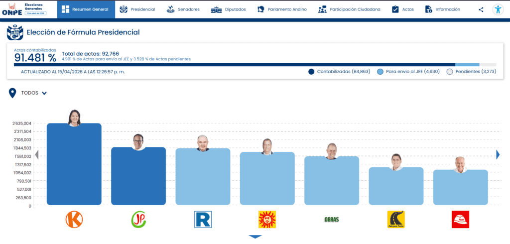 Con el avance del conteo, Fujimori ahora tiene el 17.04% de los votos, equivalente a más de 2 millones 634 mil. Roberto Sánchez le dio vuelta al tablero y escaló al segundo lugar del conteo, contando ahora con más de 1 millón 865 mil votos, mientras que Rafael López pasó al tercero y lleva acumulados más de 1 millón 832 mil.