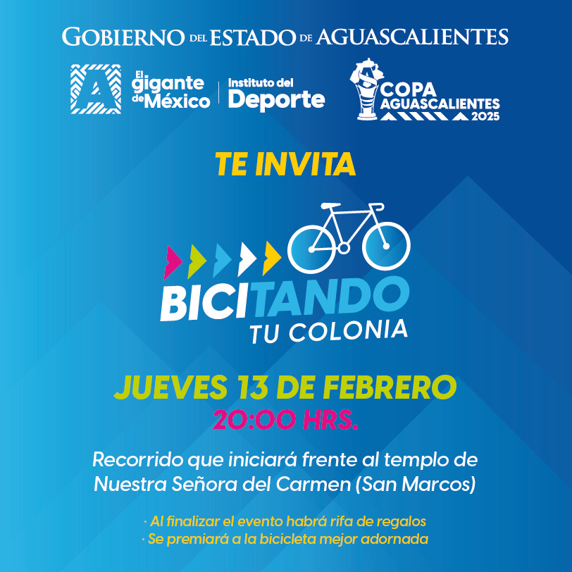 El Gobierno del Estado de Aguascalientes, a través del Instituto del Deporte, invita a ciclistas de todas las edades a participar en la rodada «Bicitando tu Colonia», que se realizará este jueves 13 de febrero a las 8:00 de la noche por las principales calles de los barrios tradicionales de la capital, en un circuito de 8.5 kilómetros.
