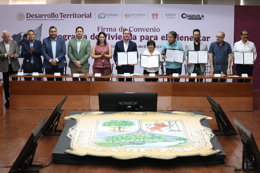 Saltillo, Coahuila de Zaragoza; a 2 de abril de 2025.– El gobernador Manolo Jiménez Salinas junto a Edna Elena Vega Rangel, secretaria de Desarrollo Agrario, Territorial y Urbano (Sedatu) firmaron un convenio de colaboración para el programa Vivienda para el Bienestar, convenio mediante el cual se otorgarán todas las facilidades administrativas y beneficios fiscales a nivel estatal y municipal con el fin de otorgar certeza jurídica a las familias coahuilenses.