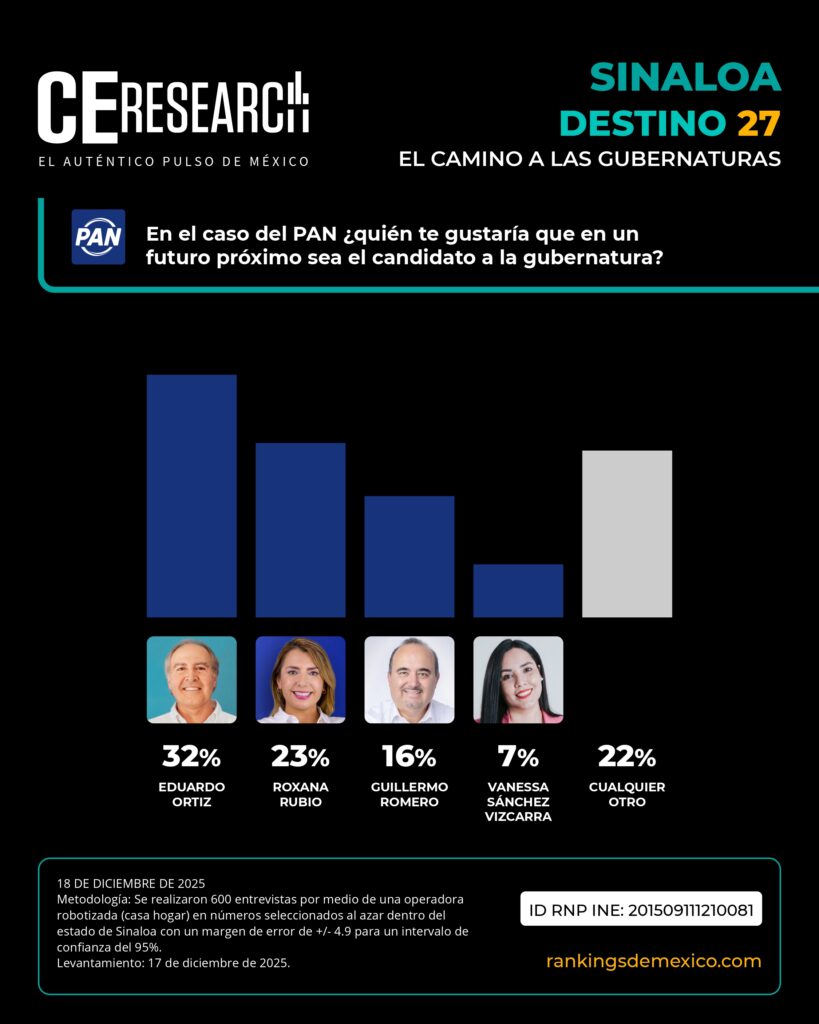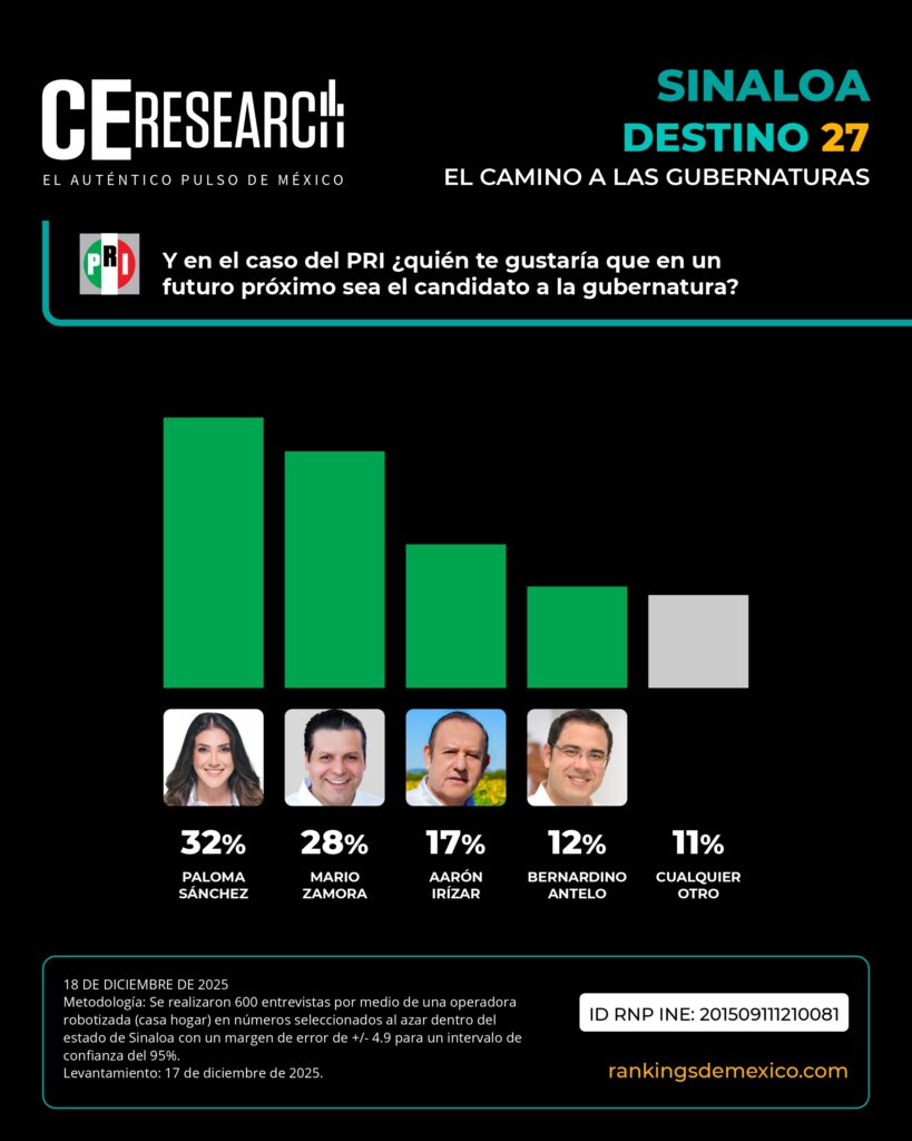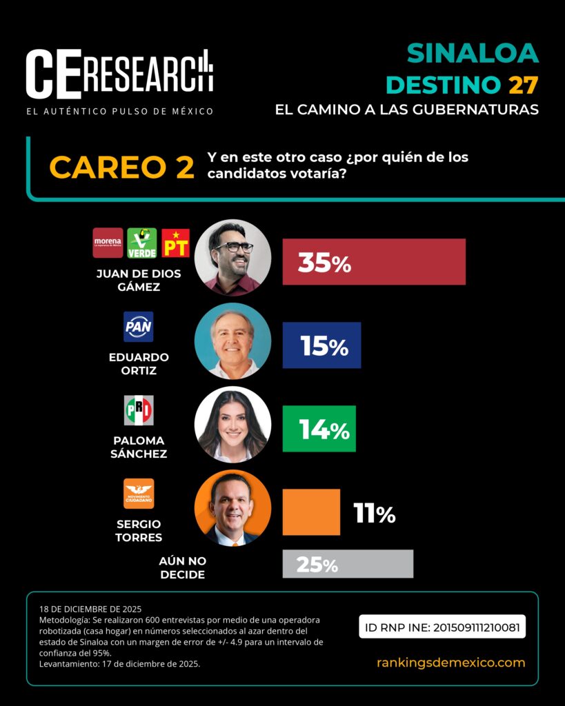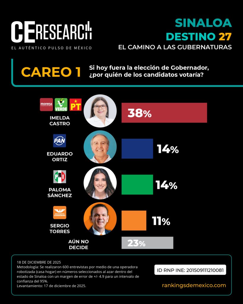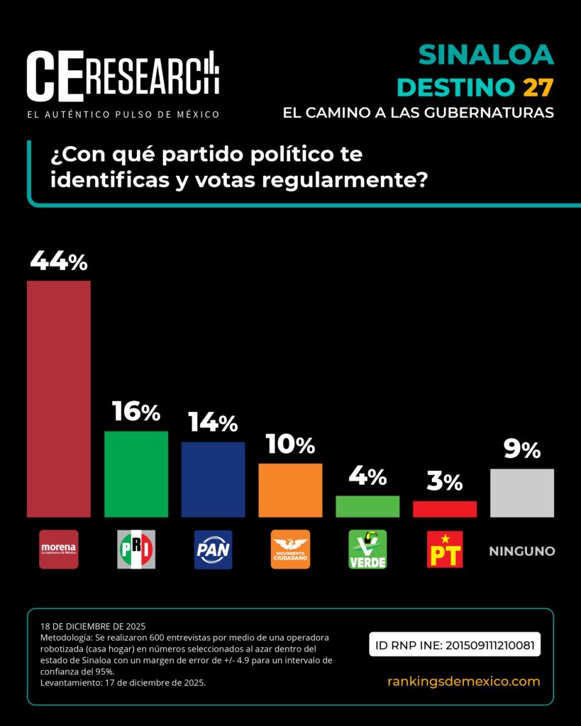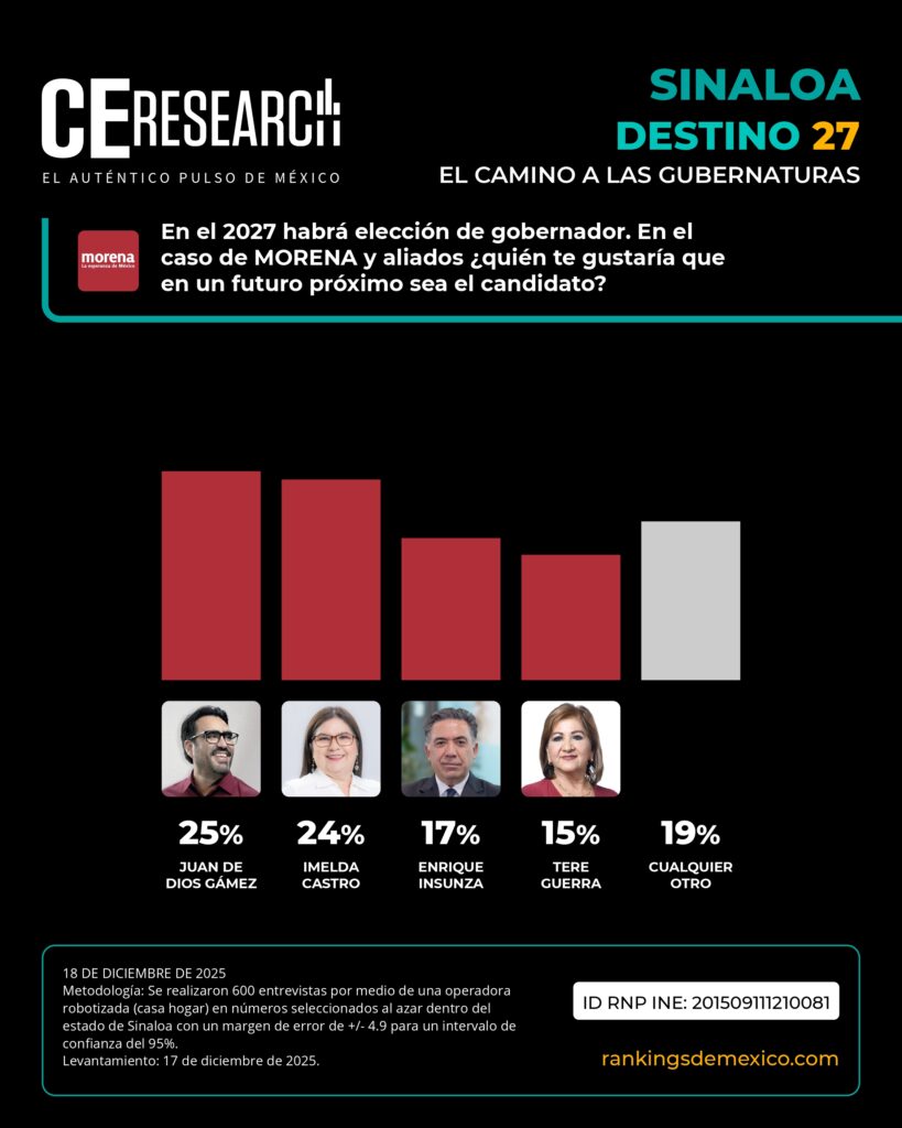 CE Research. 18 de diciembre 2025.- Mientras MORENA es el partido favorito de los sinaloenses, la auténtica lucha electoral se desarrolla dentro de ese partido, pues 3 aspirantes son punteros y pelearán los próximos meses por la nominación.