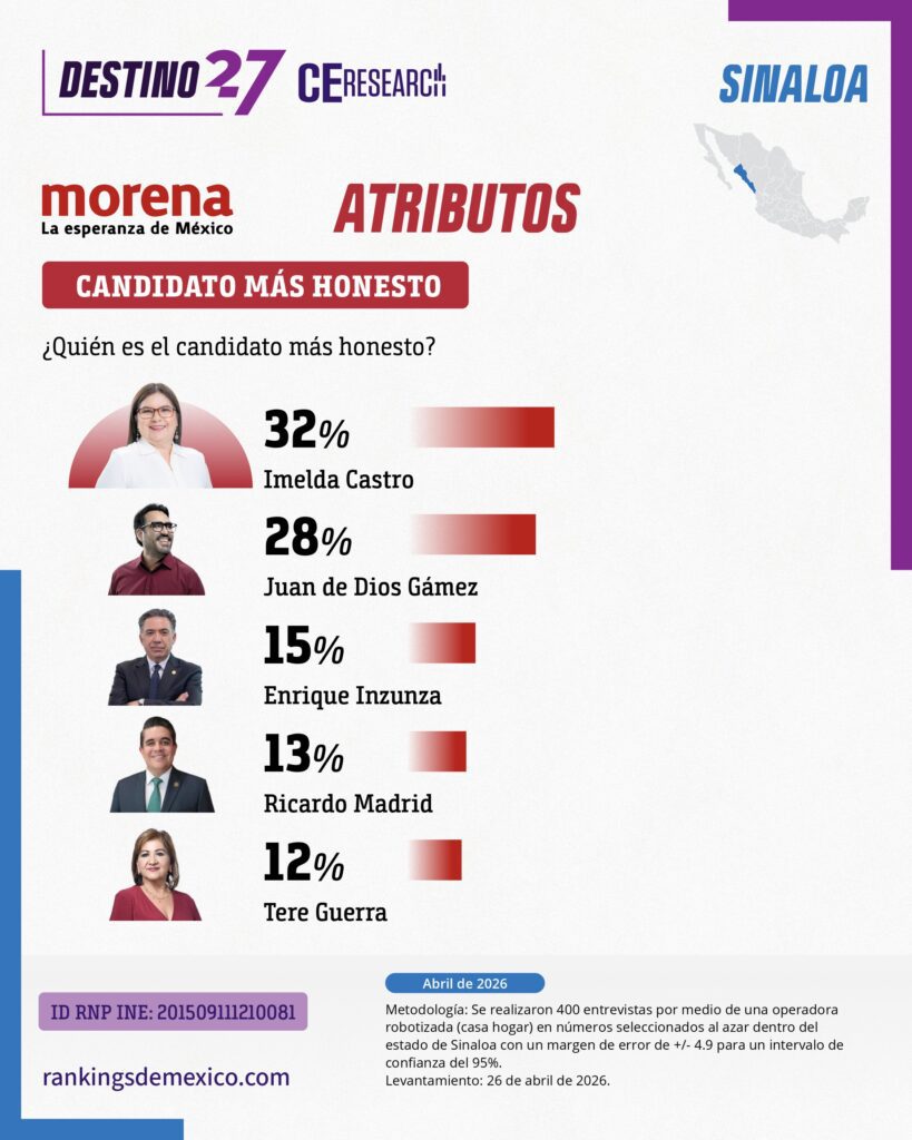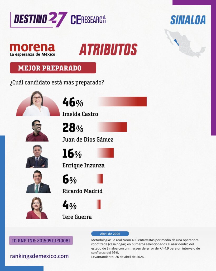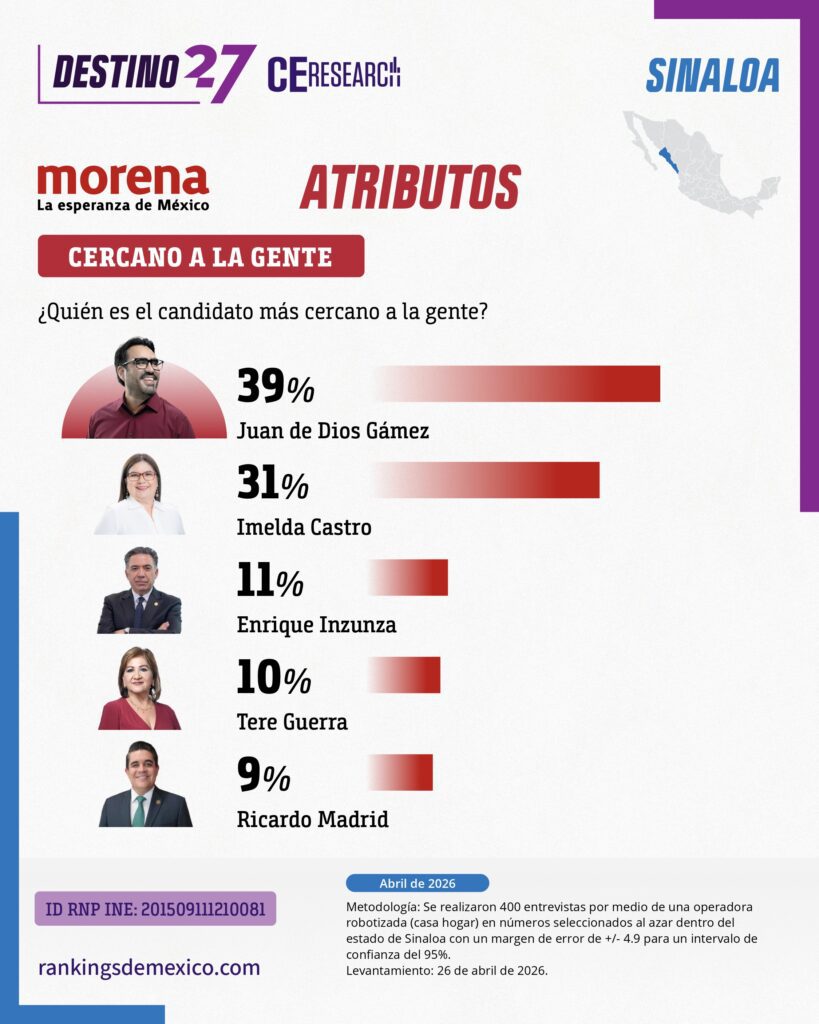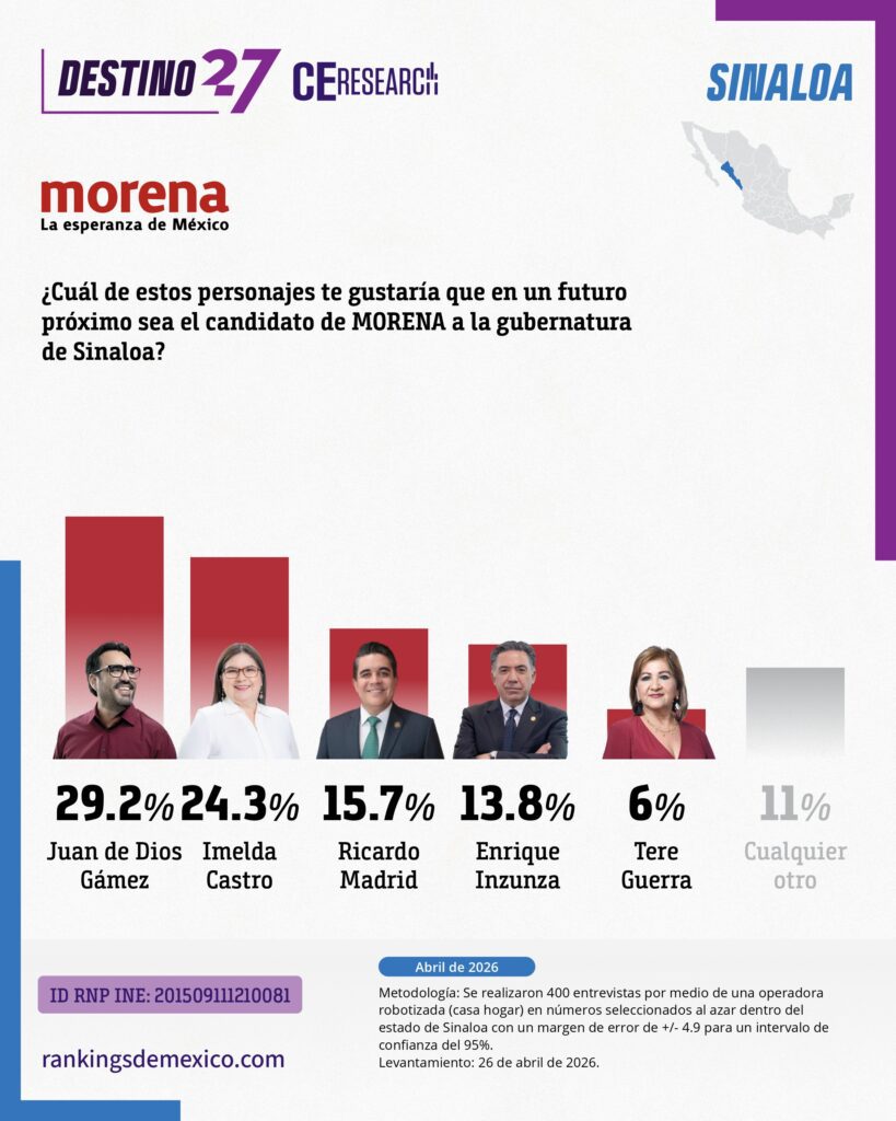Encuesta estatal en Sinaloa (abril 2026) muestra a MORENA como primera fuerza con 42.3% de identificación partidista, seguido por PAN (23.1%). En la interna de MORENA, Juan de Dios Gámez lidera con 29.2%, seguido de Imelda Castro con 24.3%, en una contienda competitiva. Gámez destaca en cercanía (39%) y capacidad de gobierno (40%), mientras Castro lidera en honestidad (32%) y preparación (46%). En el careo electoral, Gámez obtiene 38.5%, superando a PAN (19.2%), PRI (15.4%) y MC (11.5%). El estudio indica ventaja clara para MORENA en Sinaloa con competencia interna relevante entre dos perfiles principales.