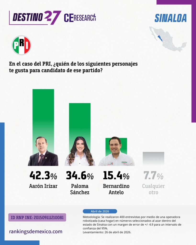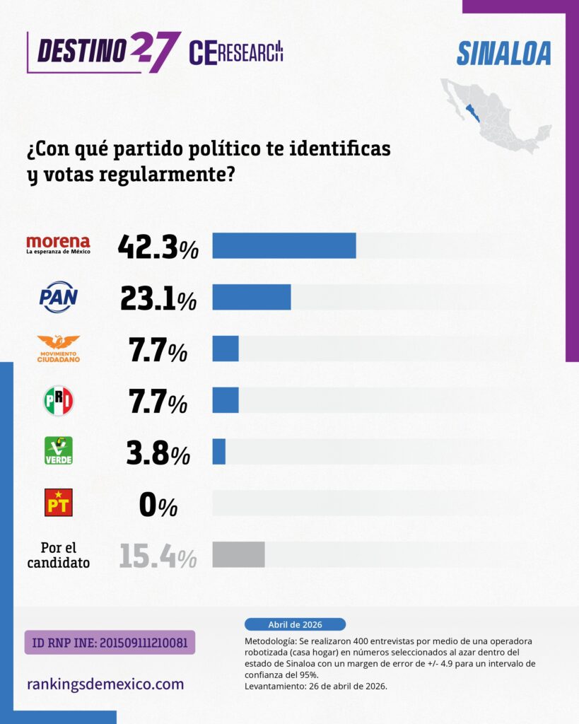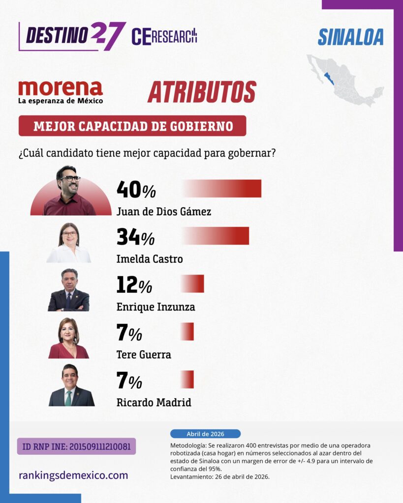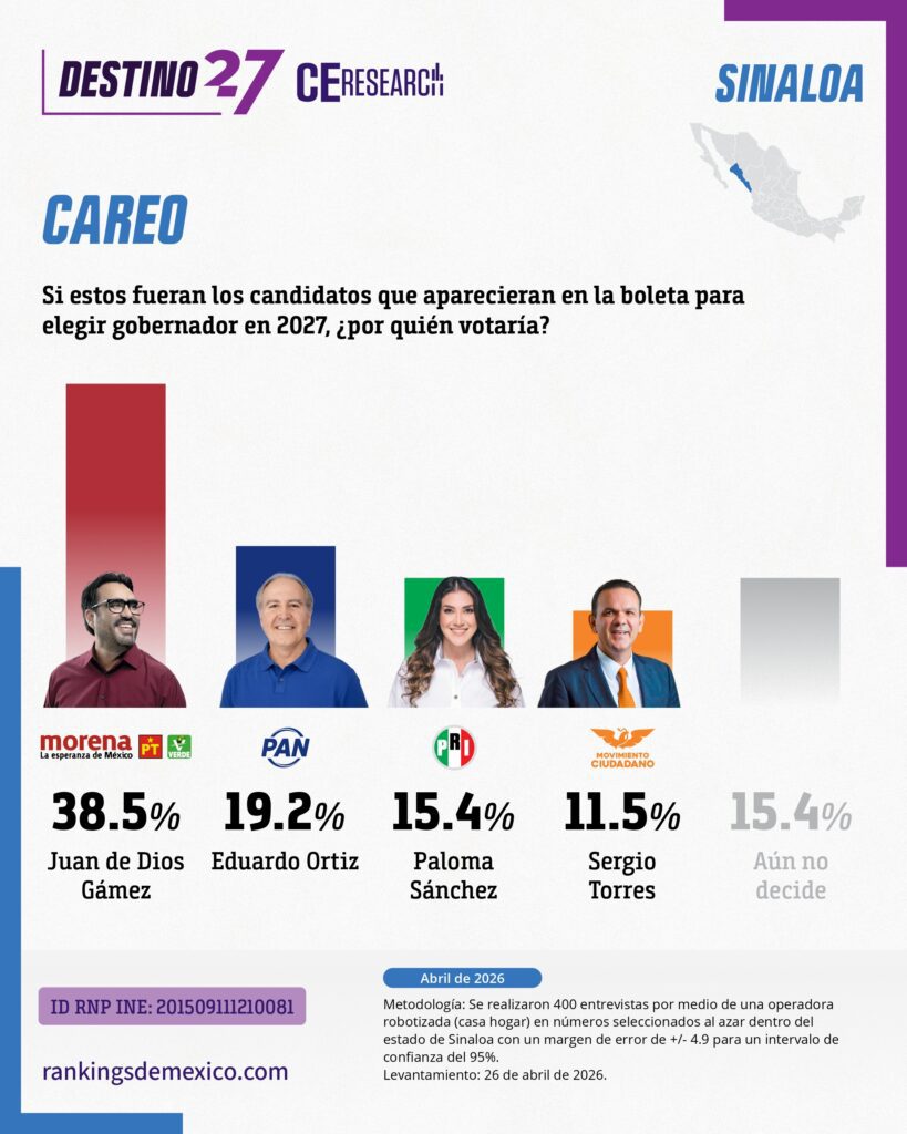 Encuesta estatal en Sinaloa (abril 2026) muestra a MORENA como primera fuerza con 42.3% de identificación partidista, seguido por PAN (23.1%). En la interna de MORENA, Juan de Dios Gámez lidera con 29.2%, seguido de Imelda Castro con 24.3%, en una contienda competitiva. Gámez destaca en cercanía (39%) y capacidad de gobierno (40%), mientras Castro lidera en honestidad (32%) y preparación (46%). En el careo electoral, Gámez obtiene 38.5%, superando a PAN (19.2%), PRI (15.4%) y MC (11.5%). El estudio indica ventaja clara para MORENA en Sinaloa con competencia interna relevante entre dos perfiles principales.