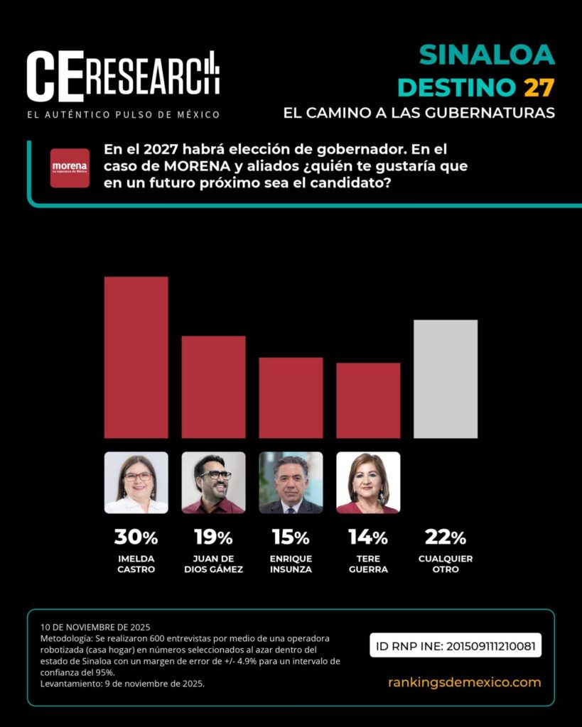 Juan de Dios Gámez, presidente municipal de Culiacán, rebasa por primera vez a la senadora Imelda Castro, aunque únicamente por un punto; sin embargo, en comparación al mes anterior, Castro disminuyó su simpatía entre los encuestados, pasando del 30% al 24%. Cercanamente se encuentra el senador Enrique Inzunza con 17%, comenzando a perfilarse como un posible contendiente.
