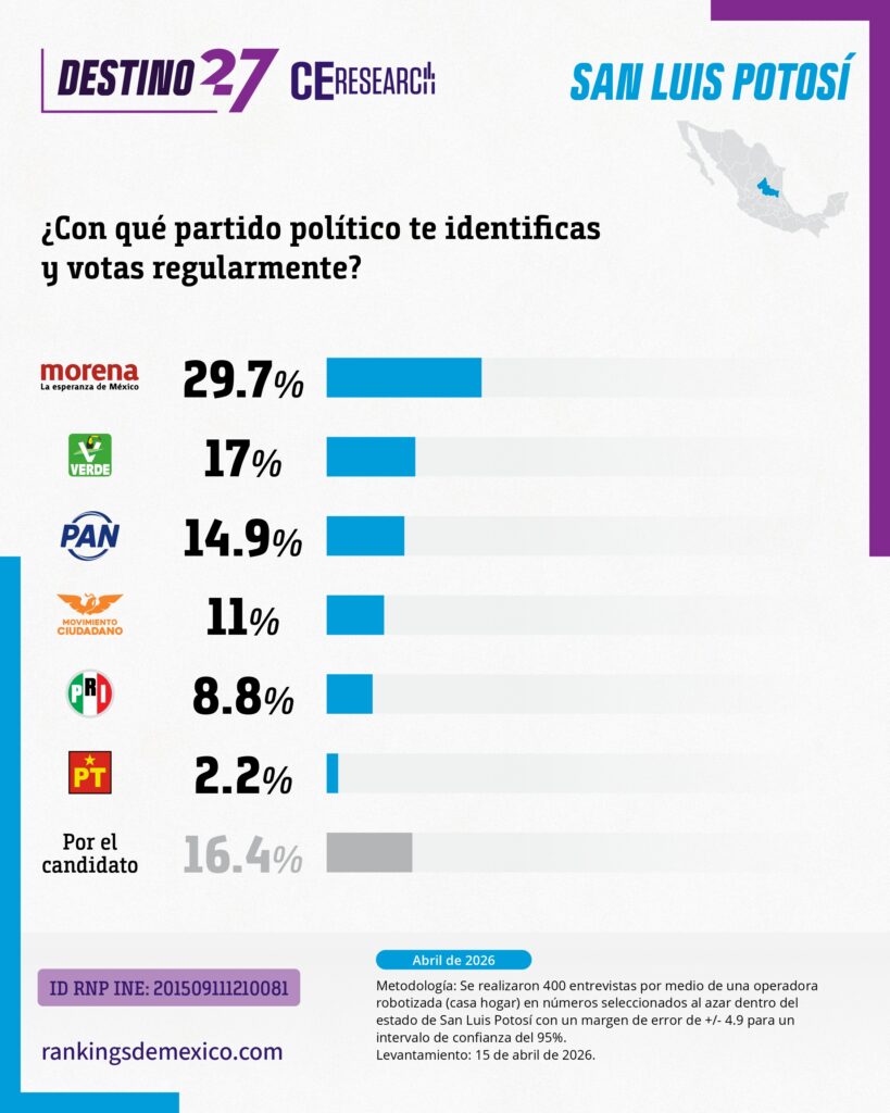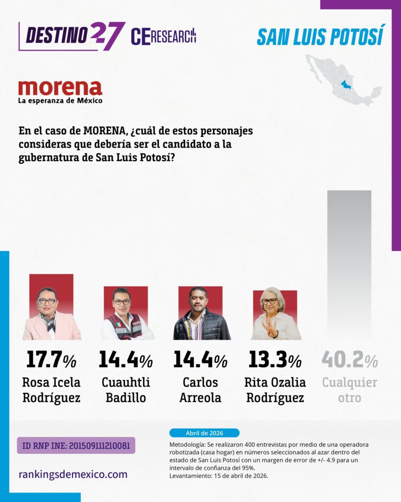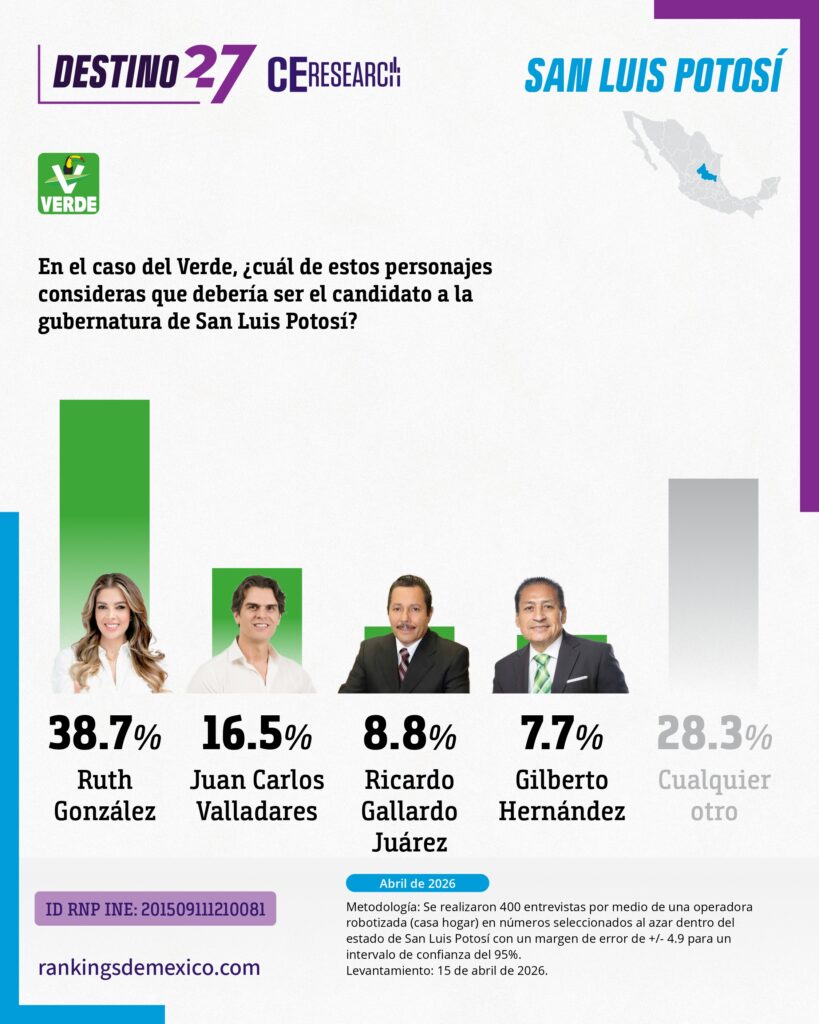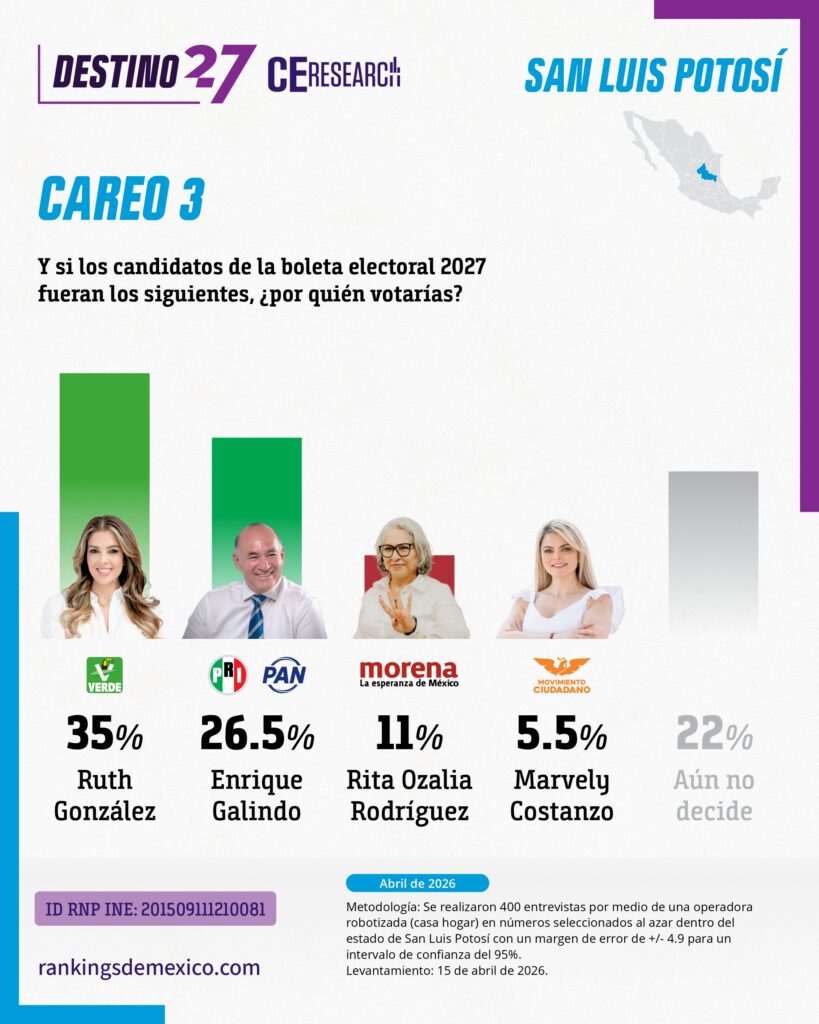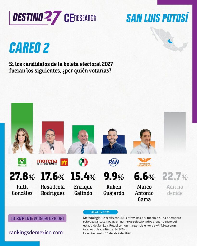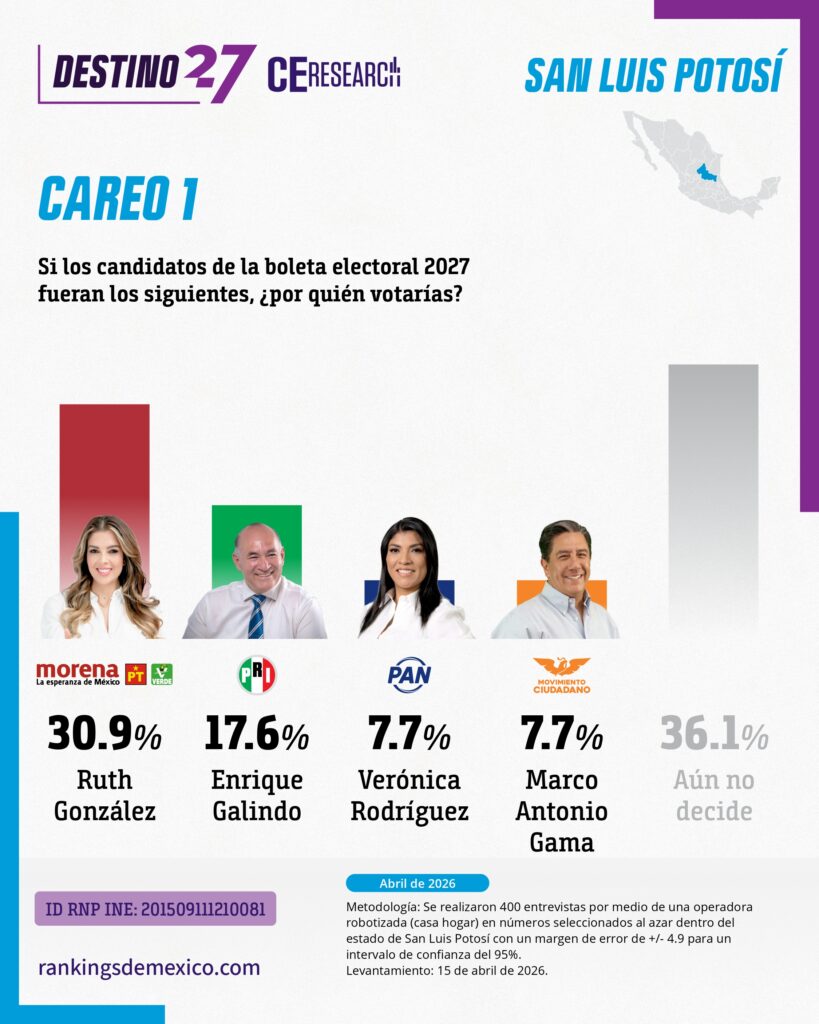 CE Research. 16 de abril 2026.- Ya sea en alianza con MORENA o sola como hace poco lo anunciaron, Ruth González lidera la carrera a la gubernatura por San Luis Potosí.