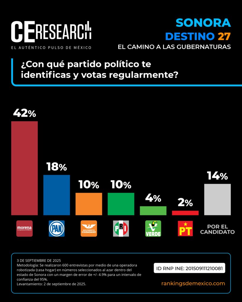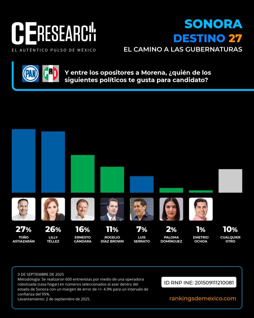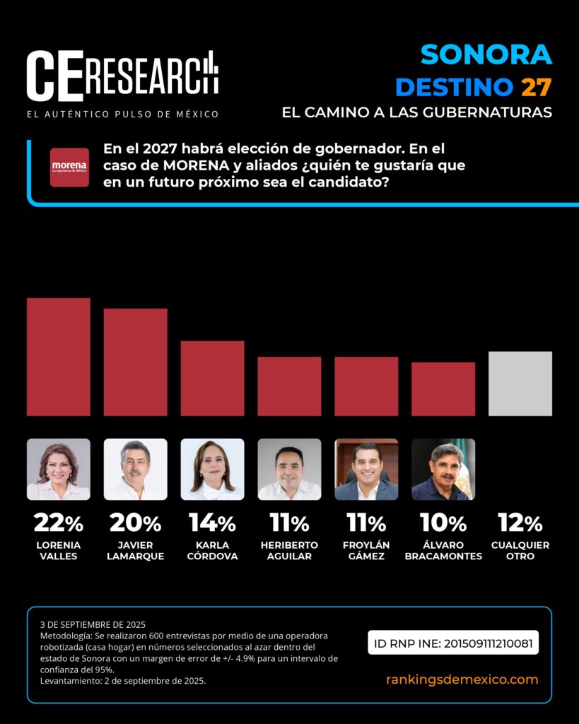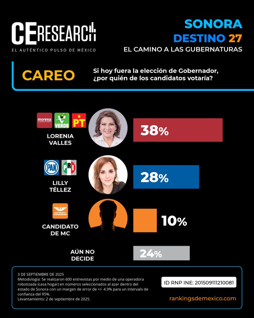 CE Research. 03 de septiembre 2025.- Si Lilly Téllez entra en la ecuación y suman a MC, no será un día de campo para MORENA, donde dos aspirantes son punteros: Lorenia Valles y Javier Lamarque.