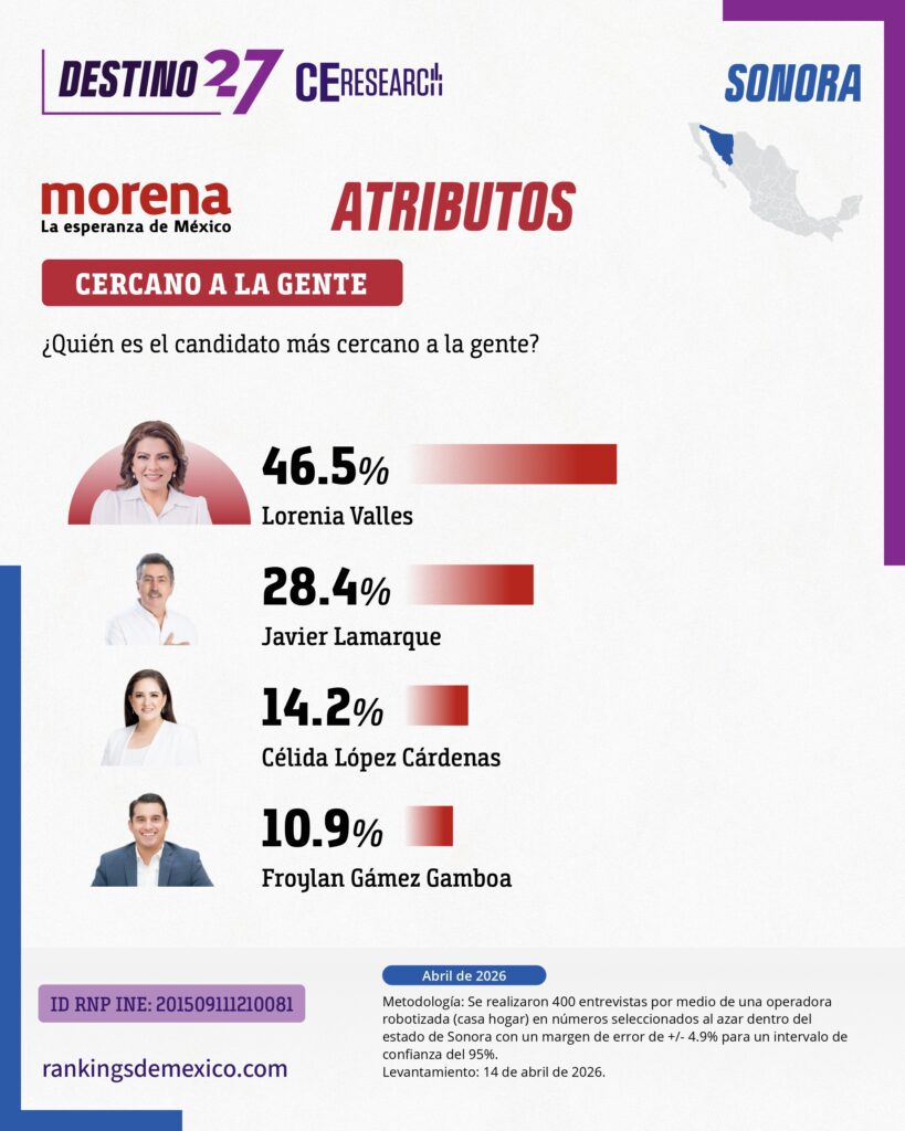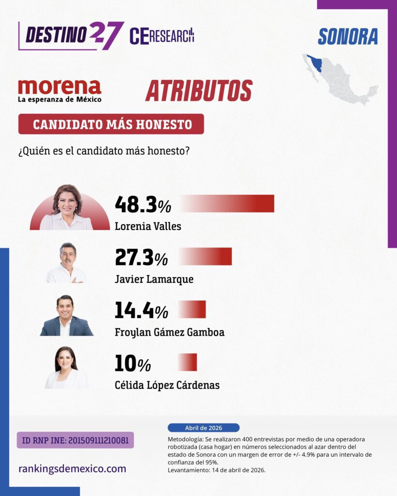 Encuesta estatal en Sonora (abril 2026) posiciona a MORENA como la principal fuerza política (40.7%), pero con alta incertidumbre en la definición de su candidatura. Lorenia Valles lidera tanto en atributos (honestidad, cercanía, preparación y capacidad de gobierno) como en intención de voto (34.6%), consolidándose como el perfil más competitivo. Sin embargo, en escenarios con Célida López, Movimiento Ciudadano con Luis Donaldo Colosio pasa al primer lugar (33.6%), evidenciando que el resultado electoral depende fuertemente del candidato de MORENA. El nivel de indecisión aumenta significativamente en escenarios menos competitivos, indicando alta volatilidad del electorado.