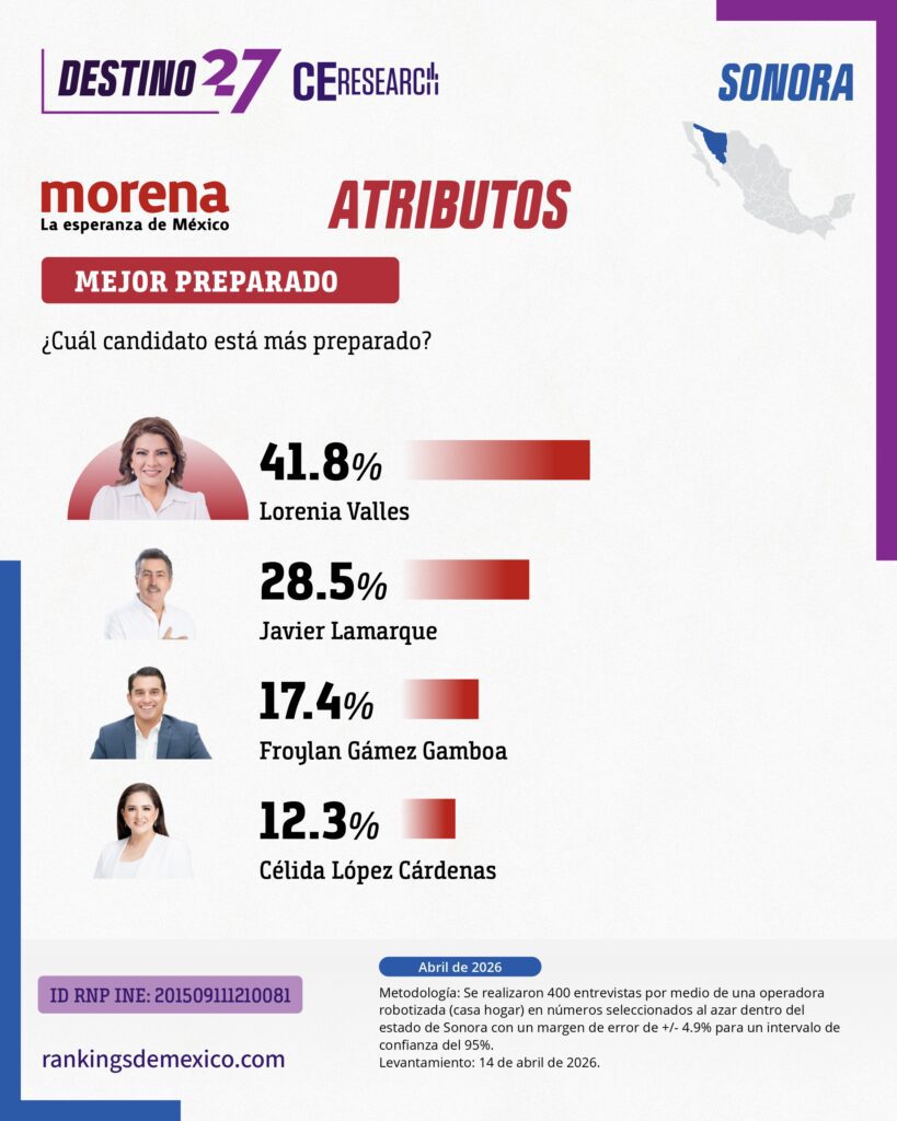 CE Research. 15 de abril 2026.– La senadora Lorenia Valles aventaja la carrera por la nominación a la gubernatura en MORENA, dejando atrás a competidores como a Javier Lamarque, Célida López o Froylan Gámez, a quienes aventaja más de dos a uno en selección directa y en atributos como honestidad, cercanía, preparación y capacidad.