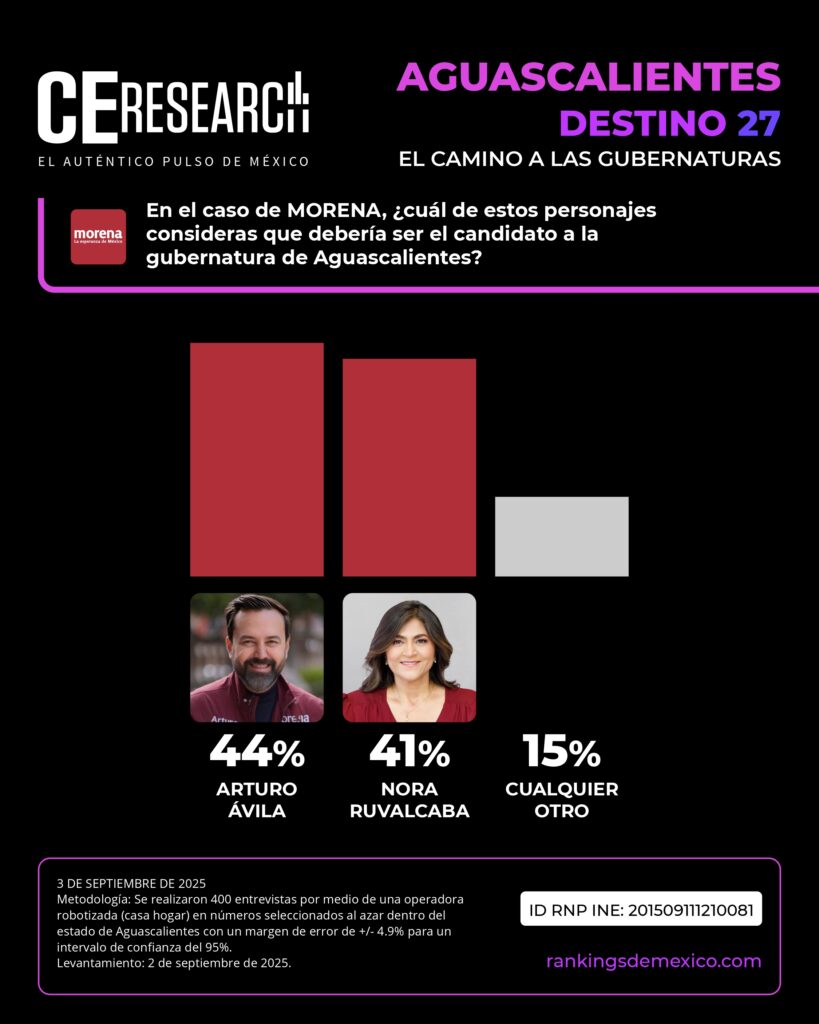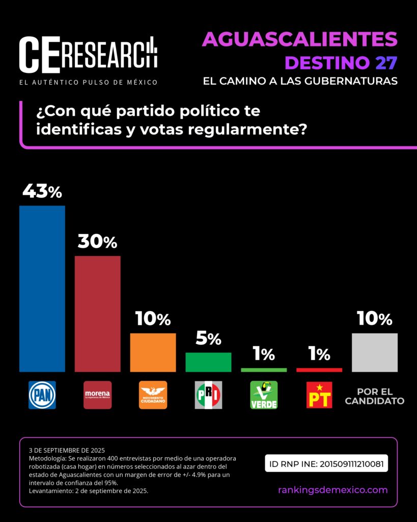 PAN lidera la encuesta Destino 27 de CE Research rumbo a las elecciones gubernamentales de 2027 en Aguascalientes, superando por más de 10 puntos a Morena.
