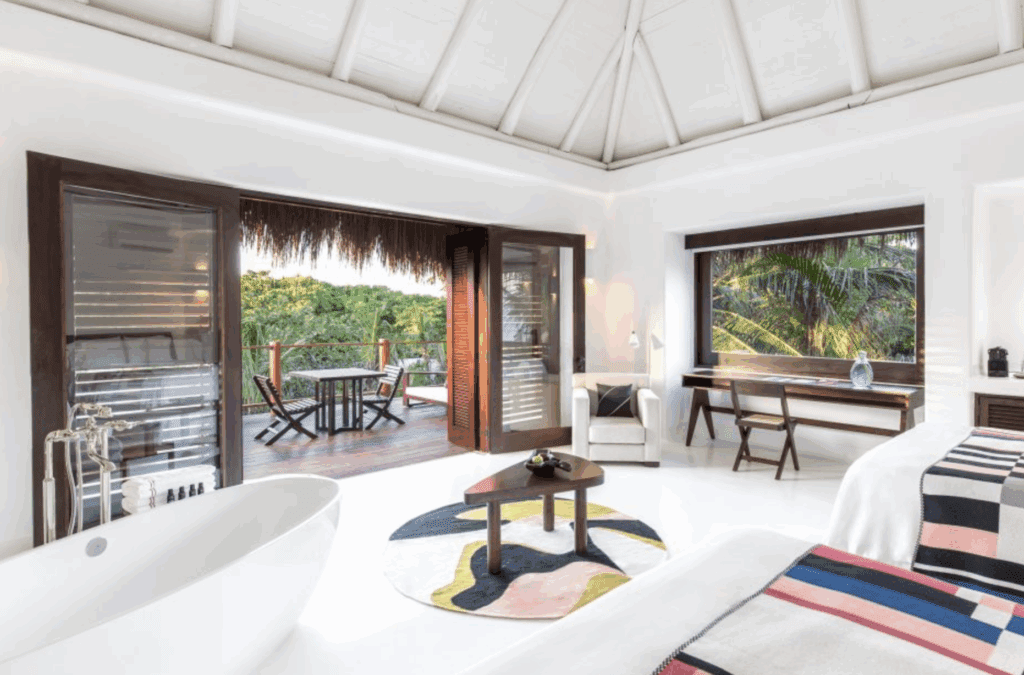 La finca de 20 hectáreas cuenta con 51 habitaciones y suites encaladas y tres villas, todas con estilo hacienda y terrazas privadas; algunas tienen piscina privada. Amplias, espaciosas y con un aire fresco y natural, parecen sacadas de una revista de arquitectura, con paredes de color blanco perla y mobiliario estilizado. Todas tienen acceso a la playa de arena color marfil, con sus cabañas cubiertas de hojas de palmera, además de dos piscinas climatizadas. En 2022, se inauguró la Mansión Esencia: una propiedad de cuatro dormitorios con tres piscinas privadas y una terraza panorámica en la azotea. Es el tipo de hotel que cuenta con helipuerto privado.