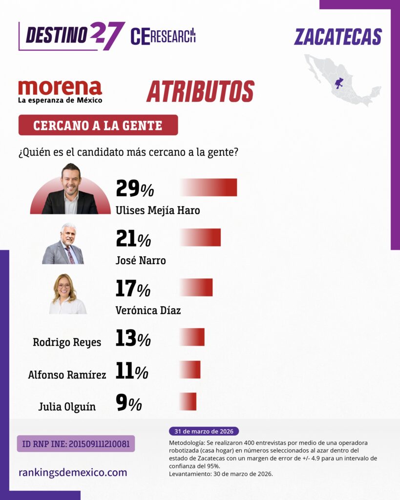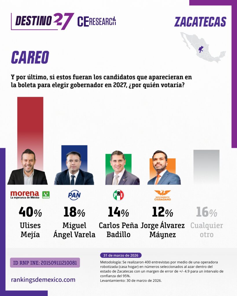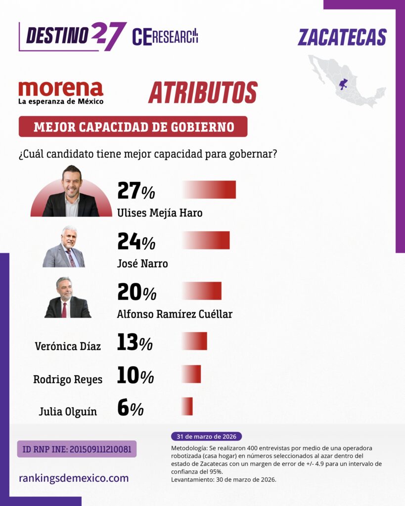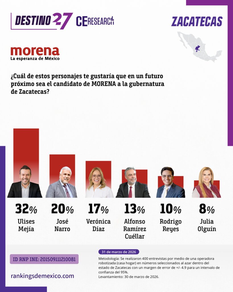 El diputado y exalcalde de Zacatecas, Ulises Mejía, es el mejor posicionado para ser el candidato de Morena rumbo a la gubernatura del estado en 2027. No solo encabeza las preferencias internas, sino que también aventaja de forma considerable a los posibles candidatos de las demás fuerzas políticas.