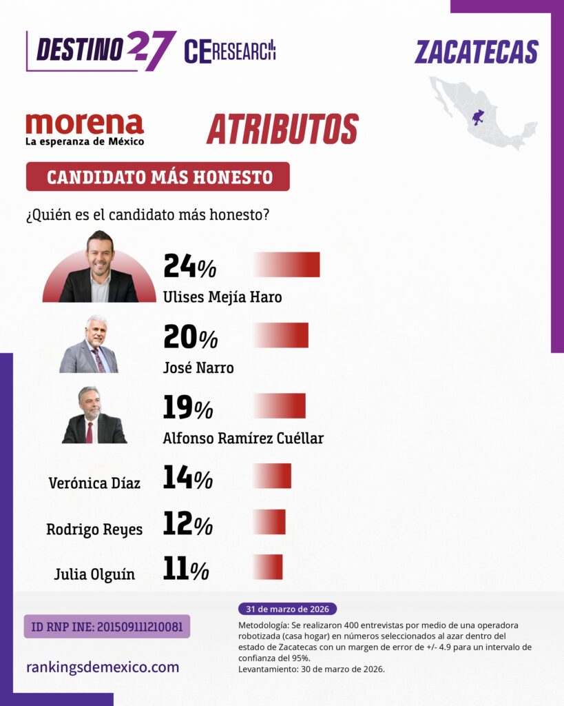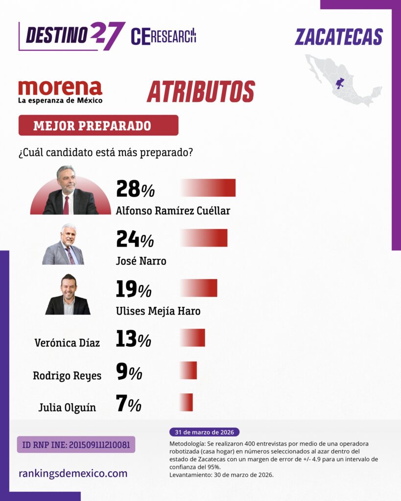 También destaca como el perfil morenista más cercano a la gente (29%), más capaz de gobernar (27%) y más honesto (24%). Por su parte, el vicecoordinador del grupo parlamentario de Morena en la Cámara de Diputados, Alfonso Ramírez Cuéllar, es señalado como el más preparado (28%), a pesar de ocupar el cuarto lugar en menciones para la candidatura.