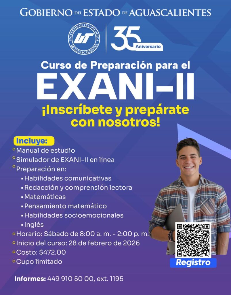 Si tu meta para este año es estudiar una carrera profesional, la Universidad Tecnológica de Aguascalientes (UTA) te ofrece el curso de preparación para el Examen Nacional de Ingreso a la Educación Superior (EXANI-II). El registro ya está abierto para el público en general en https://bit.ly/4clpuUk y cierra el 28 de febrero.
