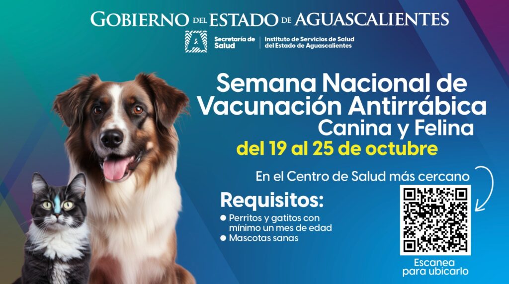 El Instituto de Servicios de Salud del Estado de Aguascalientes (ISSEA) informa que del 19 al 25 de octubre se llevará a cabo la Semana Nacional de Vacunación Antirrábica Canina y Felina 2025, con el objetivo de proteger a las mascotas y prevenir contagios.