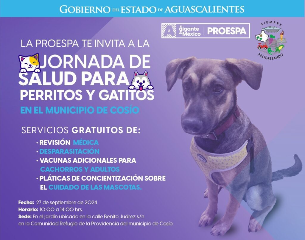 El Gobierno del Estado, a través de la Procuraduría Estatal de Protección al Ambiente (Proespa), invita a las y los propietarios de mascotas a participar en la Jornada de Salud para Perritos y Gatitos que se realizará en el municipio de Cosío.